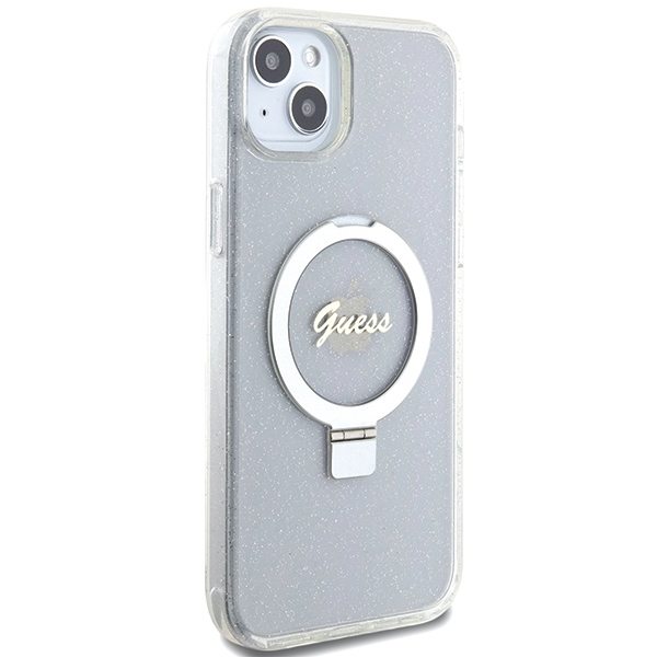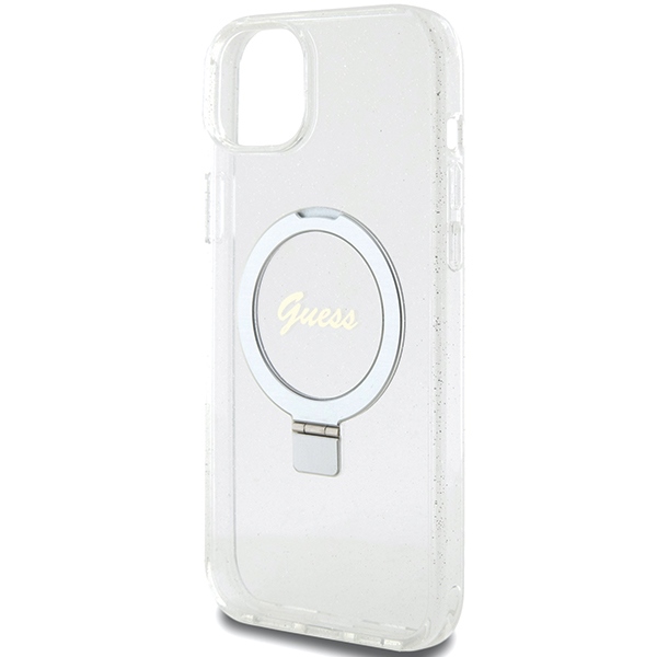 Guess GUHMP15MHRSGSD Transparent Hardcase Ring Stand Script Glitter MagSafe Kryt iPhone 15 Plus – elegancia és megbízható védelem