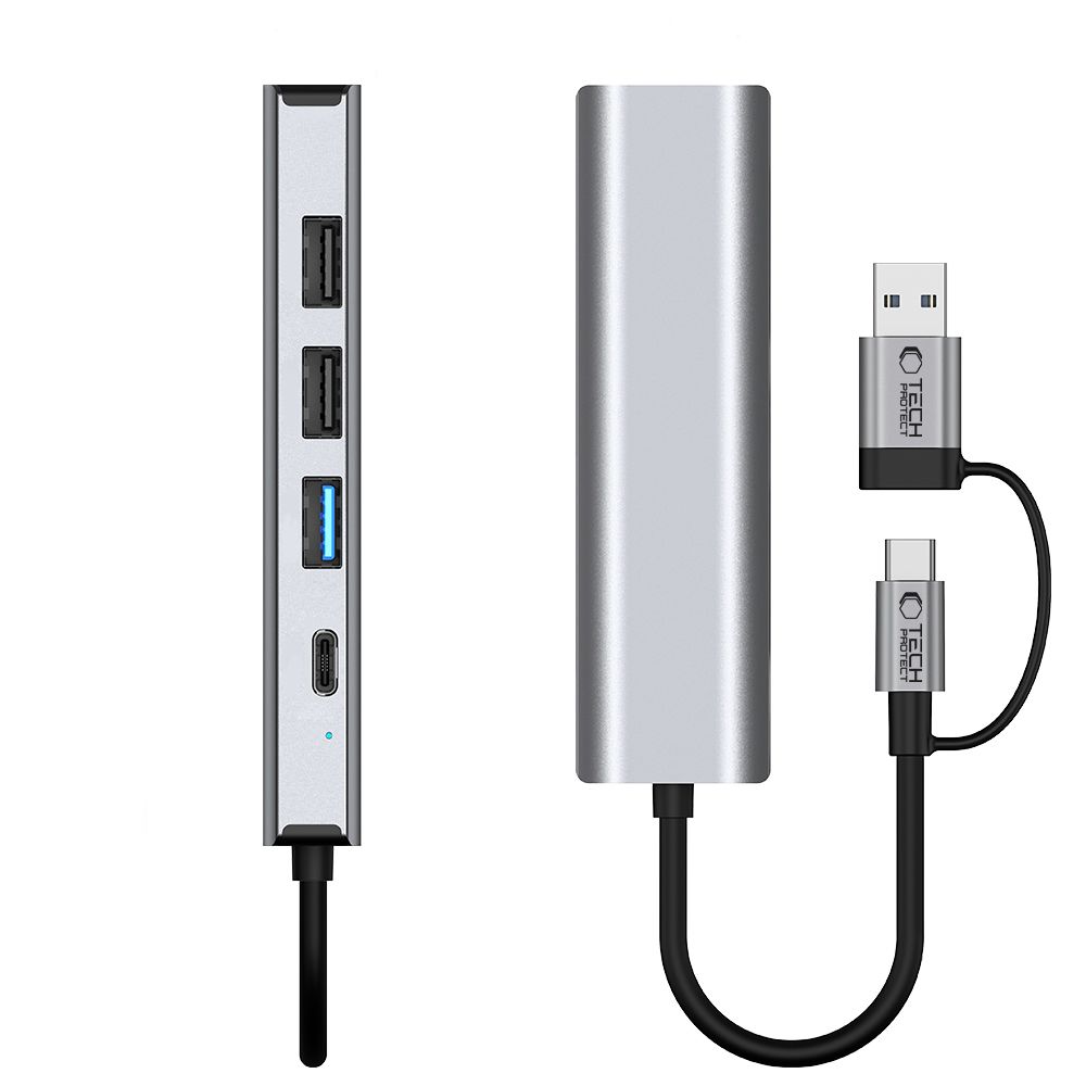 A Tech-Protect HB03 HUB Adapter 5in1 egy kompakt, multifunkciós eszköz, mely minden USB-C és USB-A porttal rendelkező számítógép számára megfelelő. Az alumínium és ABS konstrukciója miatt az adapter könnyű, ugyanakkor tartós és ellenálló. Hat porttal rendelkezik, melyek különböző funkciókat kínálnak.